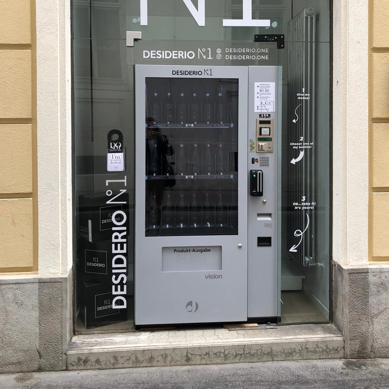 Während des Corona-Lockdowns hat die Wiener Kunstgalerie Desiderio N°1 den ersten Prosecco-Automaten der österreichischen Hauptstadt in Betrieb genommen.